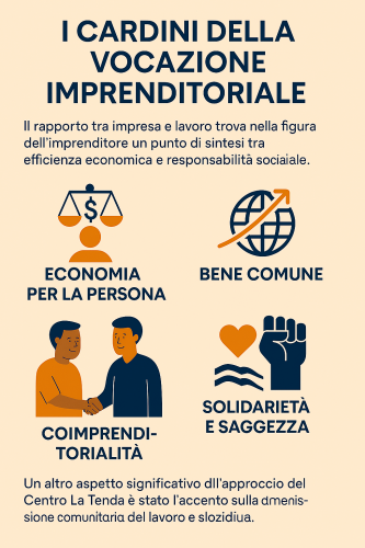 Il rapporto tra impresa e lavoro trova nella figura dell’imprenditore un punto di sintesi tra efficienza economica e responsabilità sociale. In questo modello l’economia è uno strumento al servizio della persona, ogni decisione si misura sulla dignità umana e sul bene comune, e si favorisce la coimprenditorialità perché lavoratori e imprenditori condividano gestione, utili e proprietà.