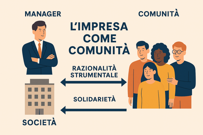 Mentre la "società", in fondo, si concentra sui rapporti contrattuali e la razionalità strumentale, la "comunità" si basa sulla solidarietà e sulla dimensione umana. L'equilibrio tra questi due concetti è essenziale per il corretto funzionamento di un'impresa, che deve essere una comunità di persone piuttosto che una società.